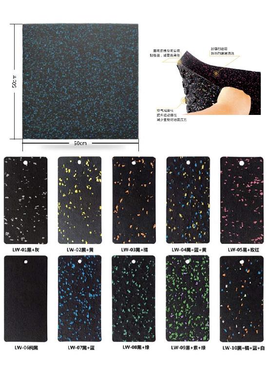 環(huán)保易清潔特性。 顏色 黑色+黃、灰、藍(lán)、綠、橘、玫 紅、等 可選厚度 15mm/20mm/25mm/30mm/35mm/50mm 可選長(zhǎng)、寬尺寸 500mm x 500mm 1000mm x 1000mm